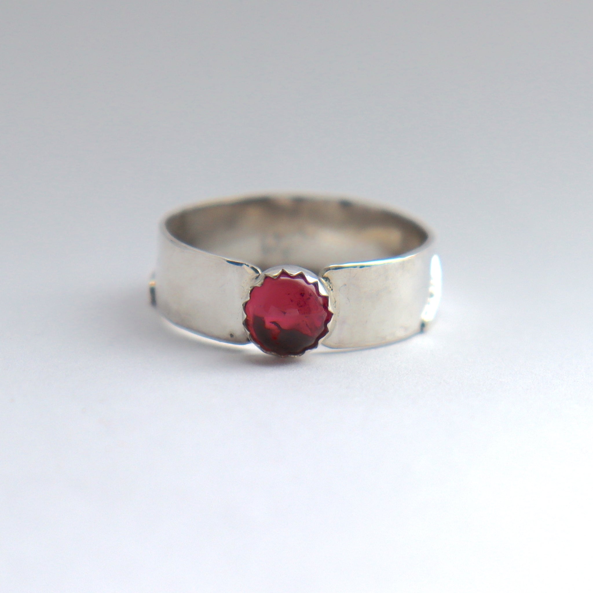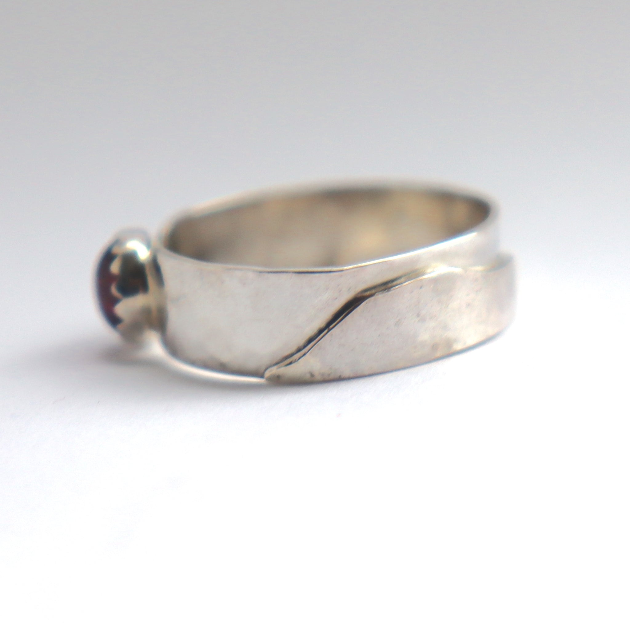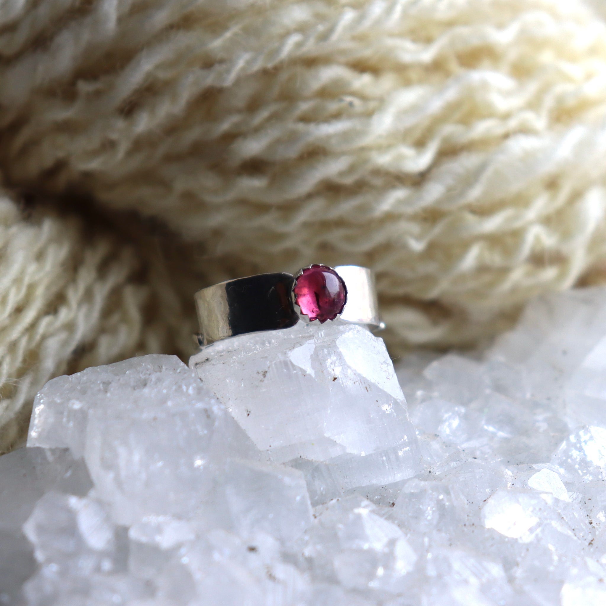 This ring features a deep pink tourmaline stone bezel set in sterling silver. The ring band also features a mountain decal made from textured and recycled sterling silver. Pink tourmaline is known to aid in calming emotions and anxiety, stimulate playfulness and spontaneity, as well as promoting growth and heart centered awareness.